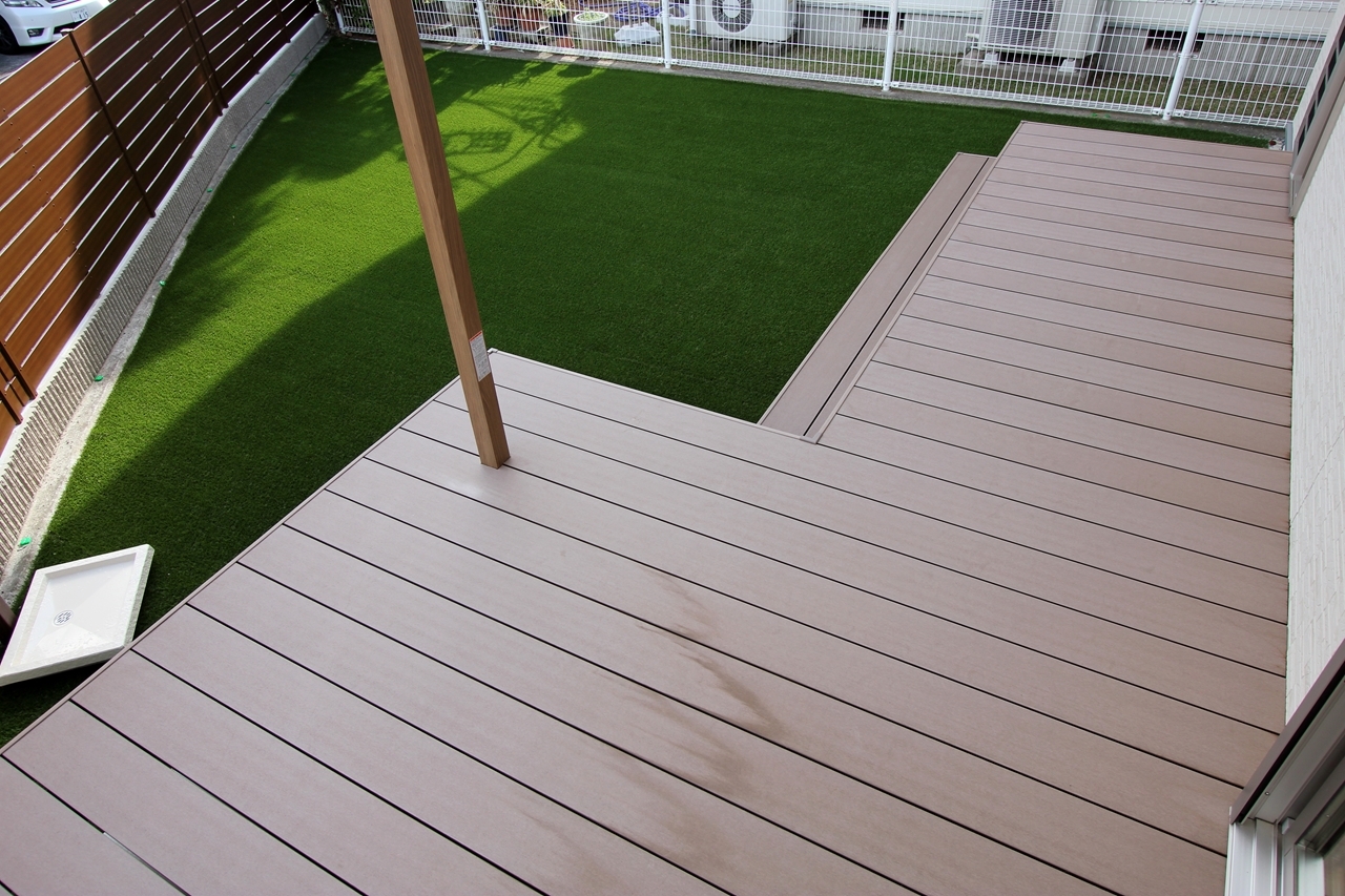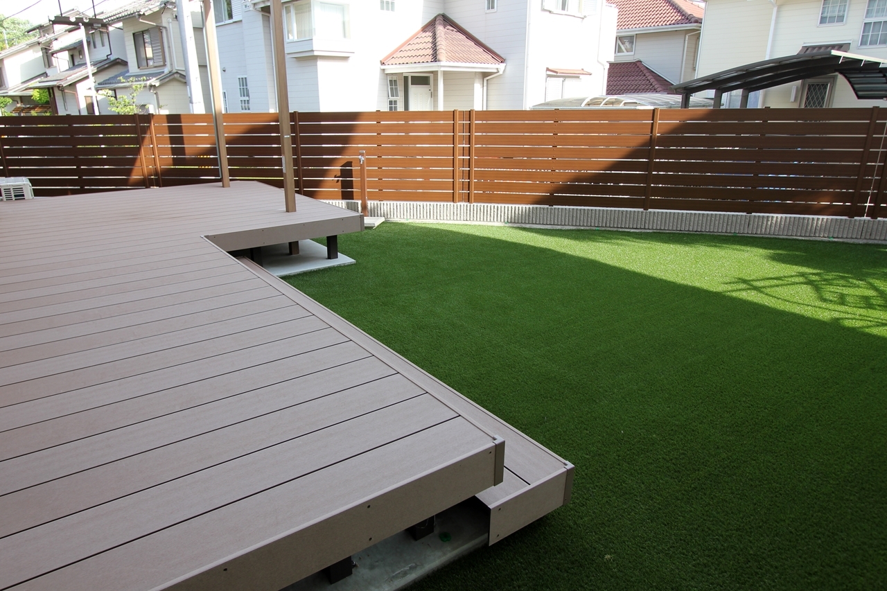 施工例200 - お庭周りの施工例 神戸市S邸 当店からのご提案 お庭のローメンテナンス、また家族の憩いスペースがほしいということでお庭作りをお手伝いさせて頂きました。 お子様が素足でも走り回れるよう人工芝を一面に配し、掃き出し窓からも出やすいように横長に人工木デッキを採り入れました。また日除け付きのテラス屋根を設置することで日差し対策や洗濯物干しスペースの確保、急な雨にも対応できます。 木目調フェンスも使用し、プライバシー保護を兼ねたナチュラルな空間になりました。 ご家族で有意義なお庭時間を過ごして頂けたらと思います。 前の施工例へ リフォーム施工例一覧へ戻る